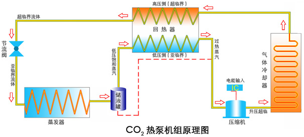 系統(tǒng)由壓縮機(jī)、氣體冷卻器、回?zé)崞?、?jié)流閥、蒸發(fā)器、貯液器組成封閉回路。低溫低壓的CO2氣體在壓縮機(jī)中壓縮至超臨界然后進(jìn)入氣體冷卻器中被冷卻介質(zhì)(水或空氣)冷卻,離開氣體冷卻器后,高壓氣體在回?zé)崞髦羞M(jìn)一步冷卻。然后CO2氣體節(jié)流降壓溫度下降,部分被液化,濕蒸汽進(jìn)入蒸發(fā)器中汽化,貯液器中出來的低壓飽和蒸汽進(jìn)入回?zé)崞?,低壓?cè)通道吸收高壓側(cè)中超臨界流體,吸熱量后成為過熱蒸汽進(jìn)入壓縮機(jī)升壓提溫,反復(fù)循環(huán)運(yùn)動。